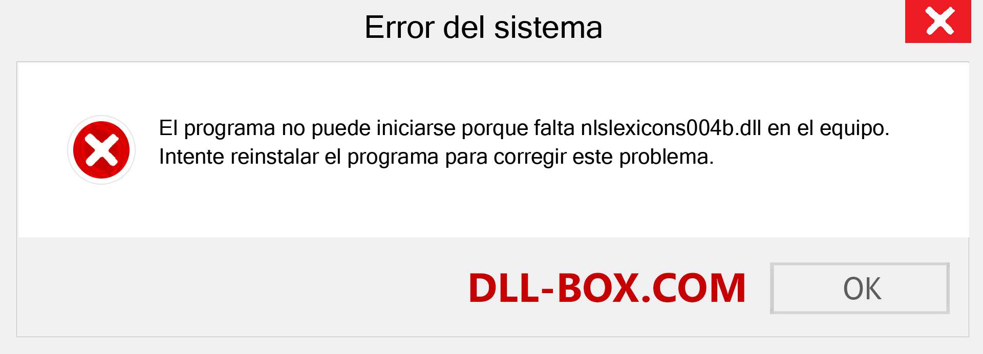1. El programa no puede iniciarse porque falta nlslexicons004b.dll en su computadora. Intente reinstalar el programa para solucionar este problema.