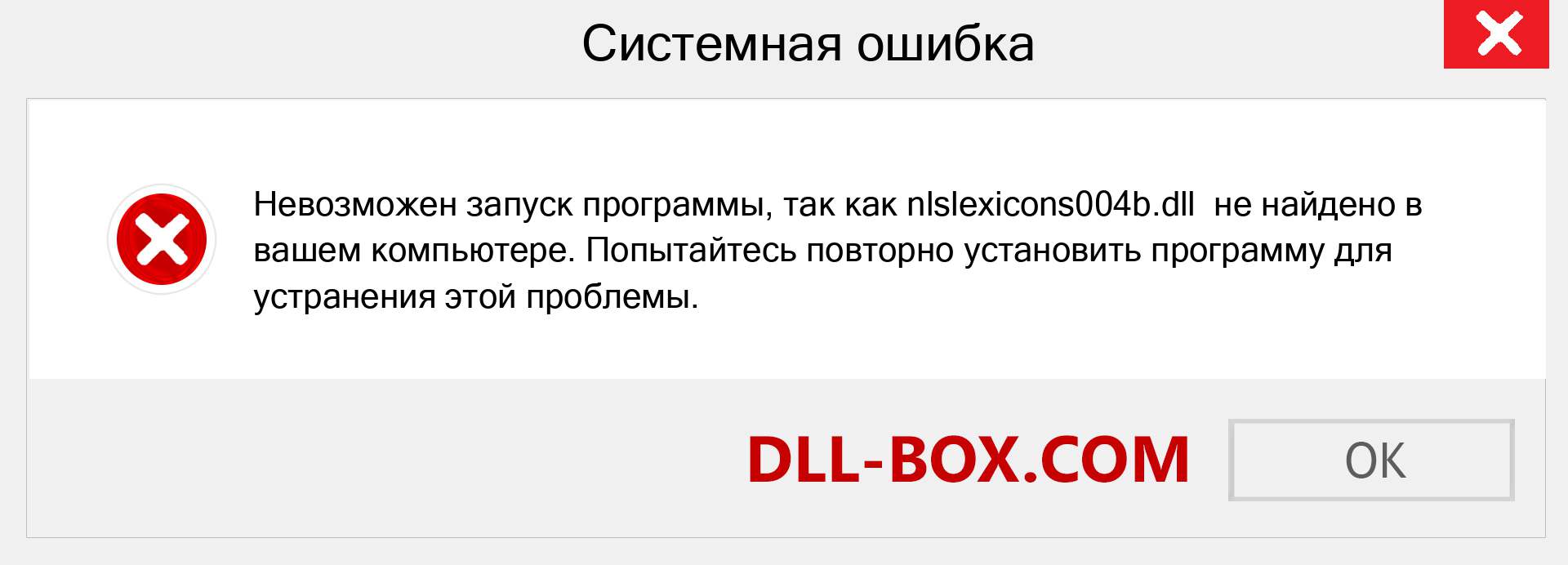 1. Программа не может запуститься, потому что на вашем компьютере отсутствует nlslexicons004b.dll. Попробуйте переустановить программу, чтобы решить эту проблему.